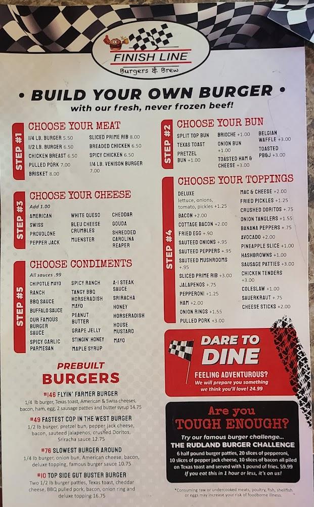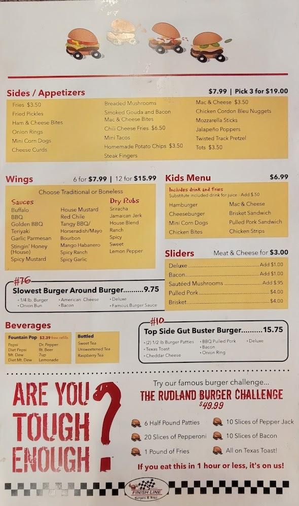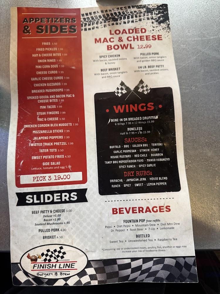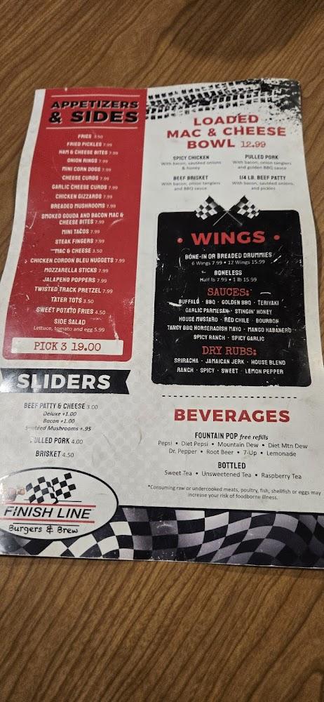 Finish Line offers a diverse menu featuring classic hamburgers, sliders, and shareable sides. Diners enjoy the flexibility of customizing their burgers. Options include various proteins, cheeses, and unique toppings. The kid's menu includes favorites like cheeseburgers and mac & cheese. Sides, like fried pickles and cheese curds, complement the main plates nicely. Daily specials provide seasonal flavors and showcase local ingredients. Prices range from $10 to $20, making it budget-friendly while delivering quality.